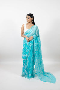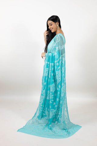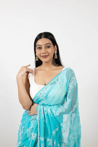 Embrace the tranquility and elegance of the Aqua Blue Chikankari Saree. The intricate Mukesh work and delicate white thread chikankari embroidery create a mesmerizing effect, making it perfect for any special occasion. With its soft, serene blue hue, this saree offers a refined, timeless beauty for those seeking a graceful ensemble.