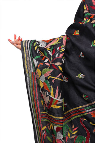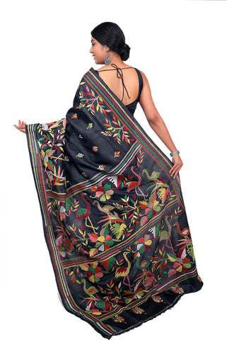 Step into grandeur with this Black Katan Silk Kantha Stitch Saree, embellished with exquisite multicolor embroidery of birds and florals. The lustrous silk base beautifully complements the vibrant threadwork, making it a masterpiece of tradition and elegance. Perfect for weddings, festive evenings, and cultural gatherings, this saree is a timeless treasure for your wardrobe.