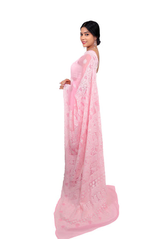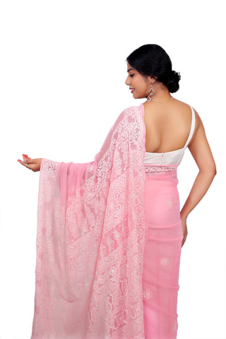Step into refined grace with this blush pink Georgette Saree, beautifully adorned with delicate white Chikankari embroidery. The lightweight fabric drapes effortlessly, while the intricate jaal work and paisley patterns add timeless charm. Perfect for those who appreciate elegance with a touch of romance, this saree is a versatile choice for festive occasions, weddings, or sophisticated formal gatherings.