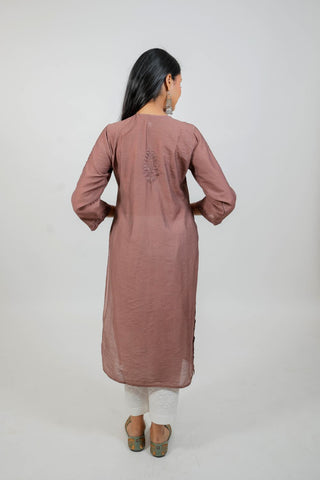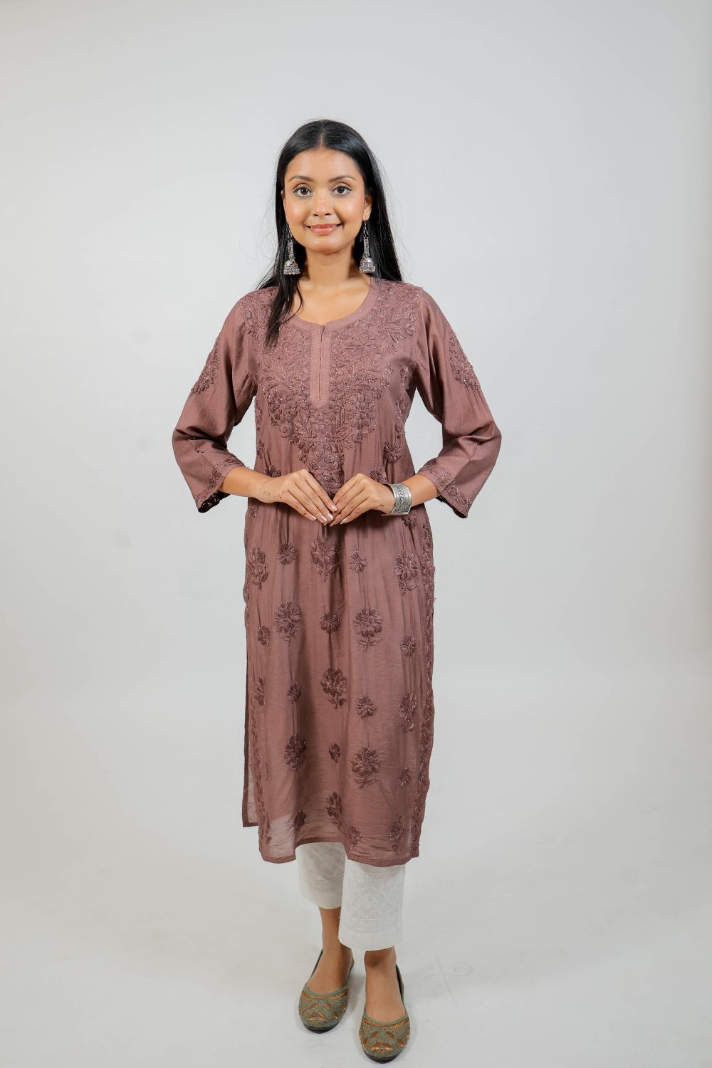 Work: Intricately embroidered with delicate white Chikankari motifs, adding traditional charm to the rich choco brown base.