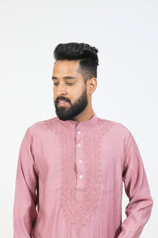 Work: Elegant dusty rose Chikankari embroidery intricately handworked across the front panel, enhancing the traditional appeal of the rich dusty rose base.