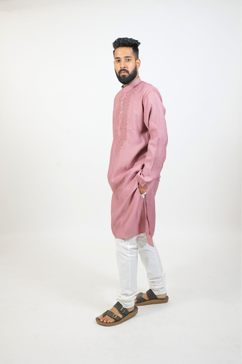 Work: Elegant dusty rose Chikankari embroidery intricately handworked across the front panel, enhancing the traditional appeal of the rich dusty rose base.