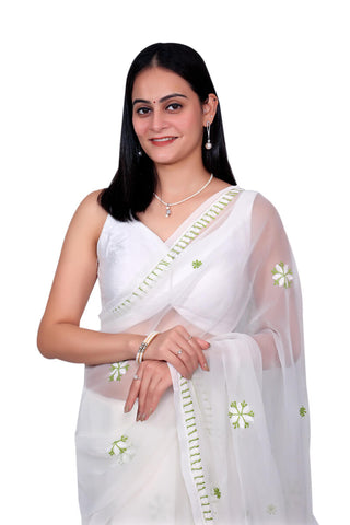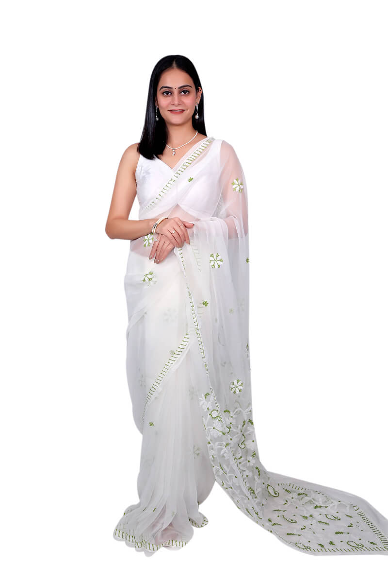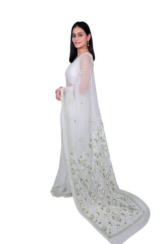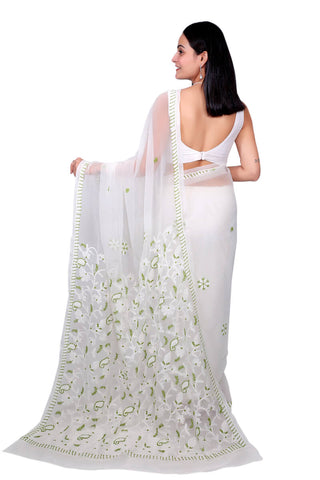 Timeless and sophisticated, this White Georgette Chikankari Saree with Green embroidery delivers classic elegance. The detailed hand-embroidered floral motifs enhance its appeal, and the lightweight georgette fabric offers effortless draping. Suitable for weddings, festive occasions, or cultural events where a refined look is required.
