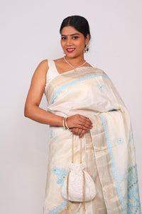 - Design: Elegant Ivory base highlighted with serene blue embroidery, featuring a beautifully detailed pallu and refined border
