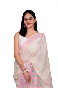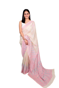 - Design: Elegant Ivory base highlighted with pastel pink embroidery, featuring a beautifully detailed pallu and refined border