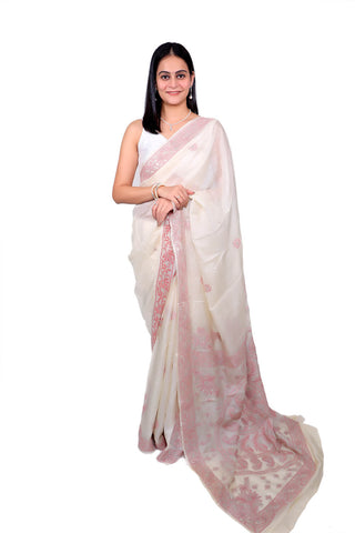- Design: Elegant Ivory base highlighted with earthy rust embroidery, featuring a beautifully detailed pallu and refined border