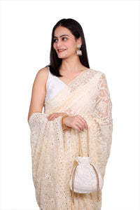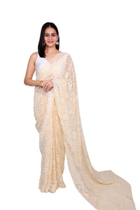 Bring timeless elegance to your ethnic collection with this ivory Fully Embroidered Georgette Saree, beautifully adorned with white Chikankari motifs and Mukesh work. The detailed embroidery across the body and pallu lends a royal appeal, while the lightweight georgette fabric ensures comfort and a graceful drape. Ideal for weddings, festive functions, and special occasions, this saree is sure to make a statement.