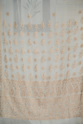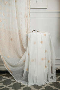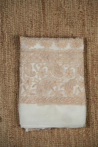 Ethereal and elegant, this Ivory White Georgette Saree features soft peach floral embroidery that blends minimalism with traditional charm. The lightweight fabric and intricate border make it perfect for refined day events.