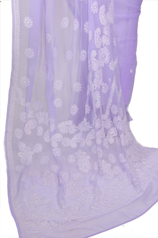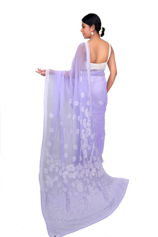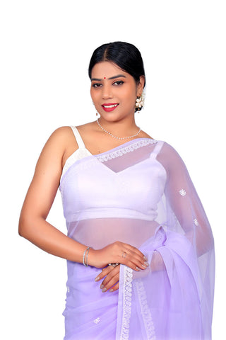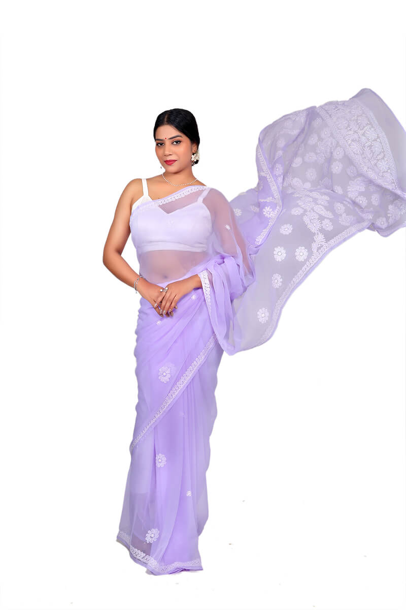 Step into timeless elegance with this Lavender Georgette Saree, adorned with delicate white Chikankari embroidery. The soft georgette fabric drapes beautifully, while the intricate detailing adds a touch of understated luxury. Perfect for those who seek a blend of tradition and modernity, this saree is versatile enough for both formal events and casual chic outings.