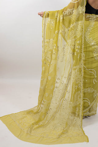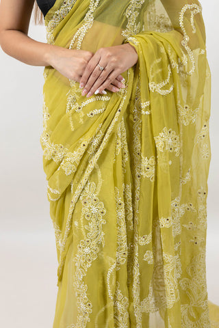 This Mehndi Green Chikankari Saree combines traditional artistry with contemporary elegance. The exquisite Mukesh work and delicate white thread chikankari embroidery bring a touch of opulence to any occasion. Crafted in a beautiful green tone, this saree exudes a sense of grace, perfect for those seeking a refined, yet festive ensemble.