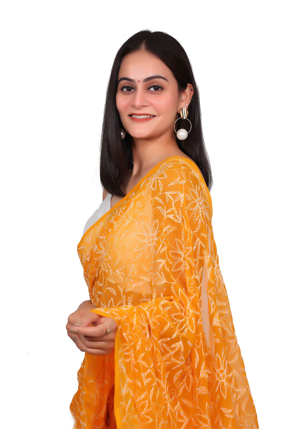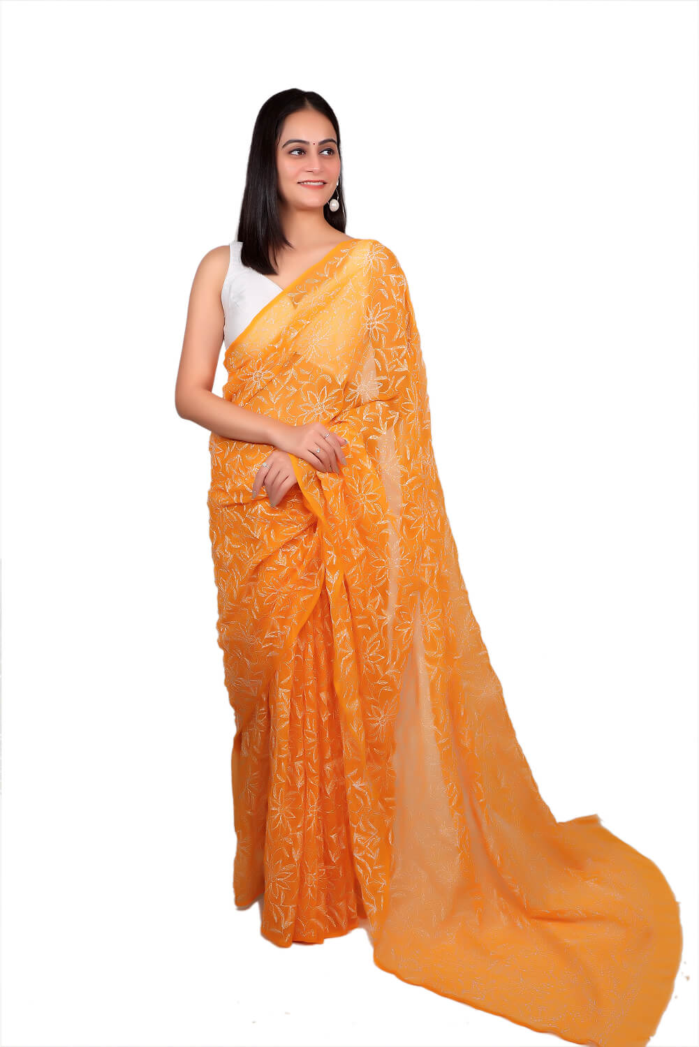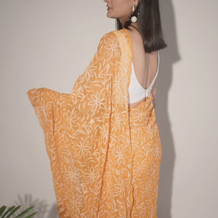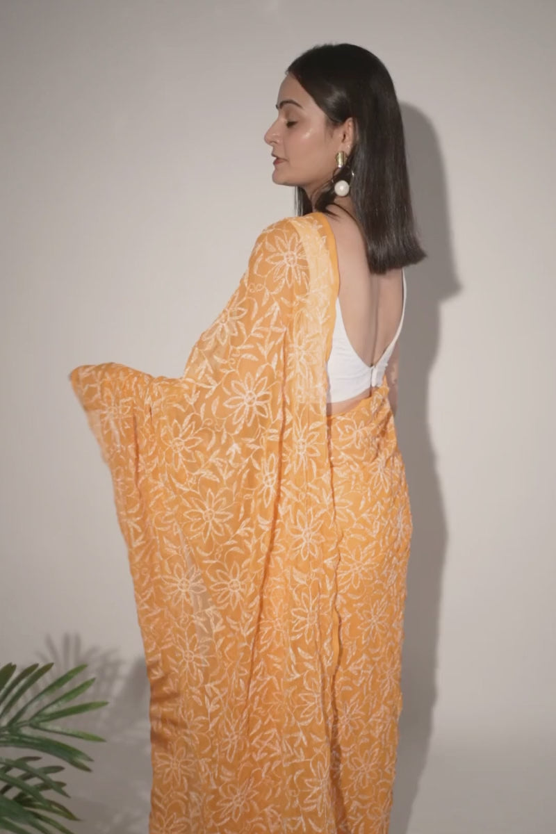 Embrace handcrafted elegance with this orange Chikankari Saree. The delicate floral embroidery against the soft orange base exudes charm and femininity, offering a dreamy, graceful look perfect for curating bespoke ethnic ensembles.