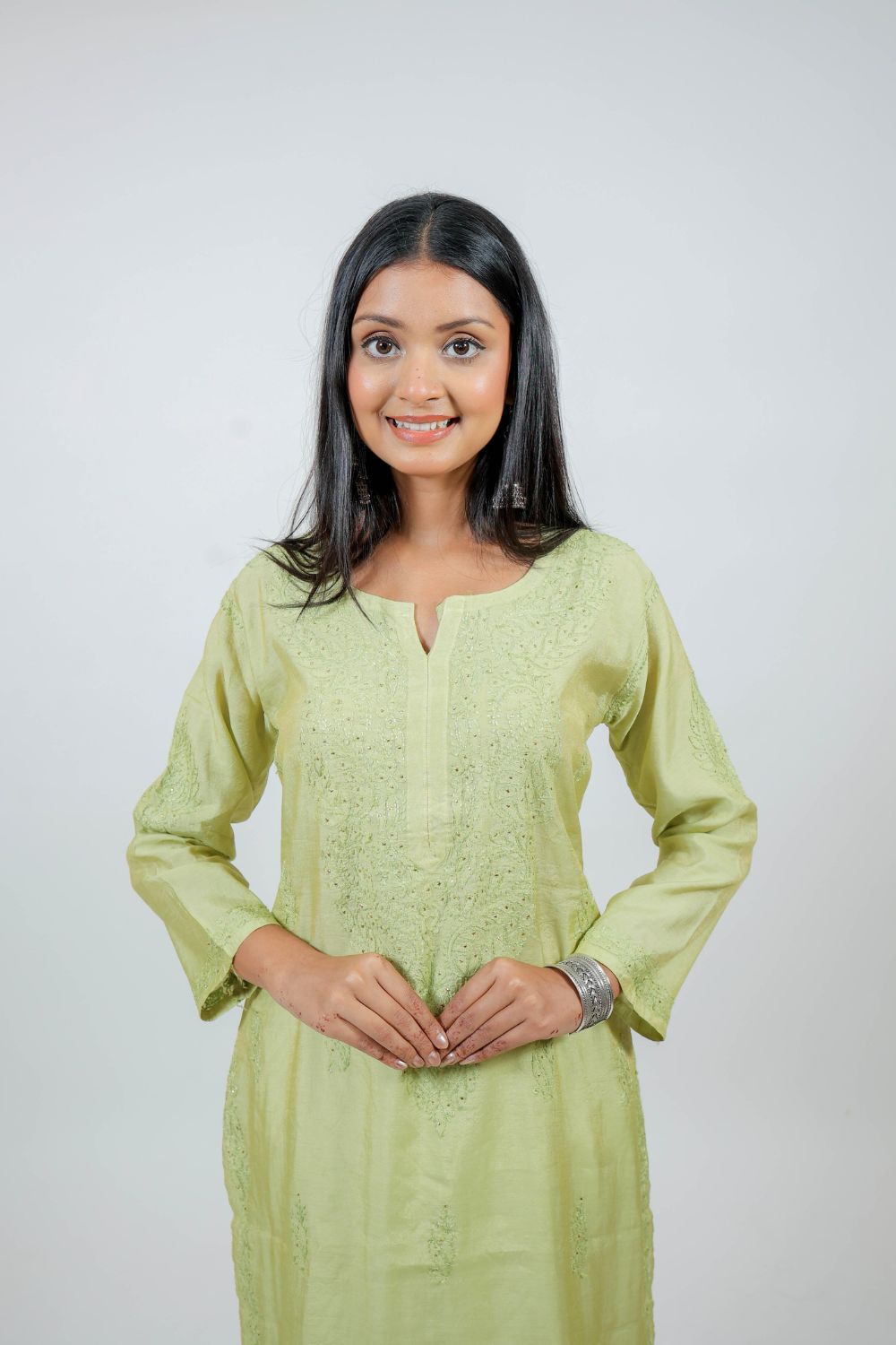Inform when this item available Parrot Green Chanderi Silk Chikankari Kurti