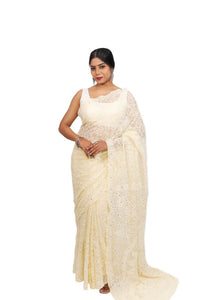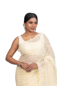 Bring timeless elegance to your ethnic collection with this Pastel Yellow Fully Embroidered Georgette Saree, beautifully adorned with white Chikankari motifs and Mukesh work. The detailed embroidery across the body and pallu lends a royal appeal, while the lightweight georgette fabric ensures comfort and a graceful drape. Ideal for weddings, festive functions, and special occasions, this saree is sure to make a statement. Comes with an unstitched blouse piece to customize your look.