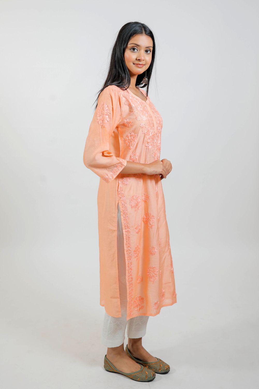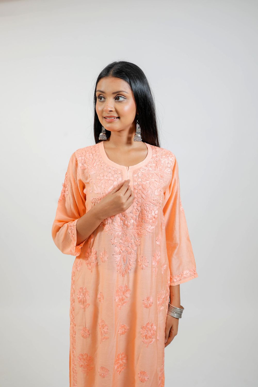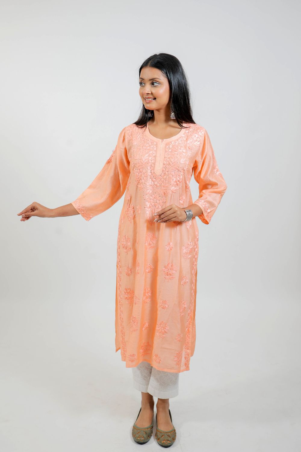 Work: Intricately embroidered with delicate Chikankari motifs, adding traditional charm to the soft peach base.