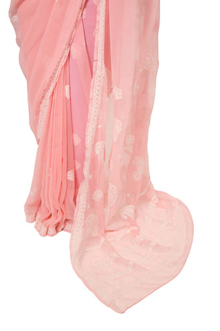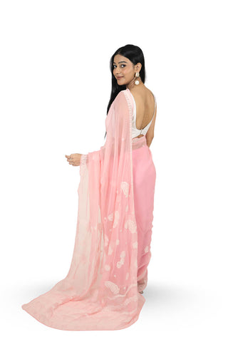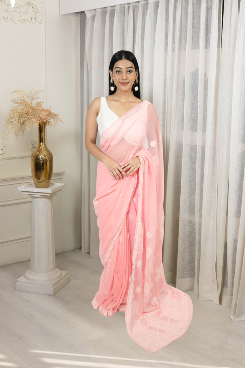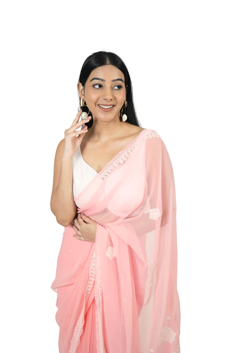 Grace your special occasions with this stunning pink Georgette Saree, beautifully enhanced with intricate white thread chikankari embroidery. The lightweight drape and exquisite detailing create the perfect blend of sophistication and celebration.