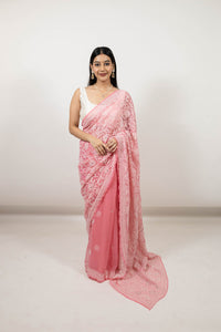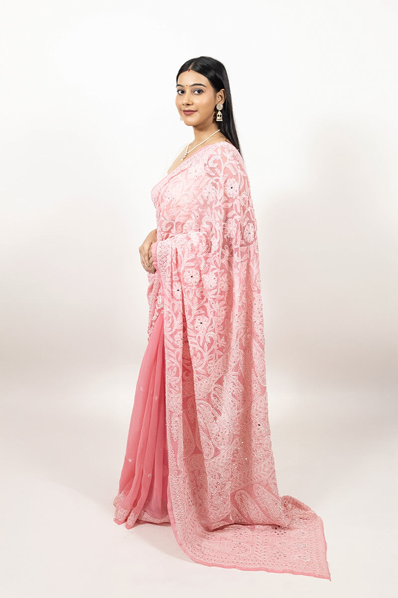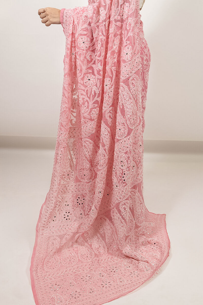 Unveil timeless elegance with this beautiful Pink Georgette Saree, featuring a blend of Mukesh and Mirror Work alongside the artistry of traditional Chikankari Embroidery. The intricate floral motifs, paired with the glimmering Mukesh and Mirror accents, create a striking contrast on the soft pink fabric. Ideal for weddings, traditional gatherings, and festive celebrations, this saree beautifully combines modern sparkle with classic handcraft, ensuring you make a statement at every occasion.