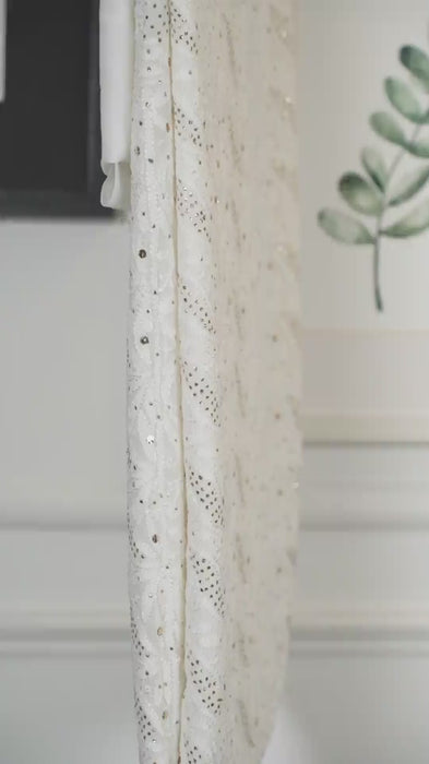 This pure white pure georgette chikankari unstitched kurta piece features intricate Resham Dhaga Chikankari embroidery, enhanced with Mukesh and Gota Patti detailing for a regal touch. The set includes an unstitched kurta piece and dupatta (bottom fabric not included). The dyeable fabric allows you to customize it in your preferred shade. Lightweight and elegant, this piece is perfect for festive occasions and special celebrations.