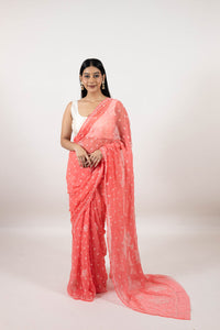 This stunning rosy pink georgette saree combines fine Mukesh work with intricate white thread embroidery, featuring small floral designs that elevate the elegance of the piece. The soft pink hue paired with the detailed craftsmanship makes this saree a perfect addition to any festive or wedding wardrobe, ensuring a timeless and graceful look.