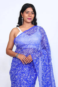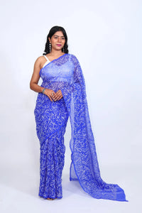 Embrace handcrafted elegance with this Royal Blue Chikankari Saree. Featuring delicate floral embroidery on a sheer base, it offers a dreamy, feminine look perfect for creating custom ethnic ensembles.
