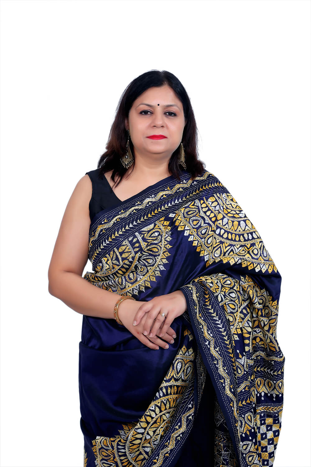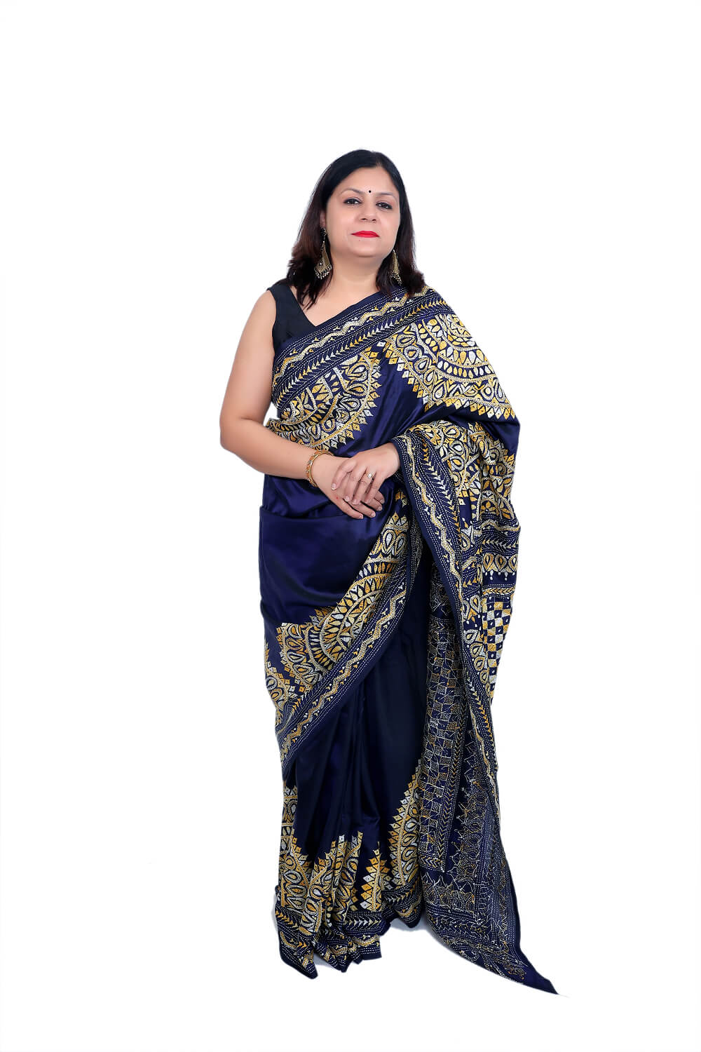 - Work: Traditional Kantha stitch embroidery with intricate floral and geometric motifs in mustard-gold and white thread
