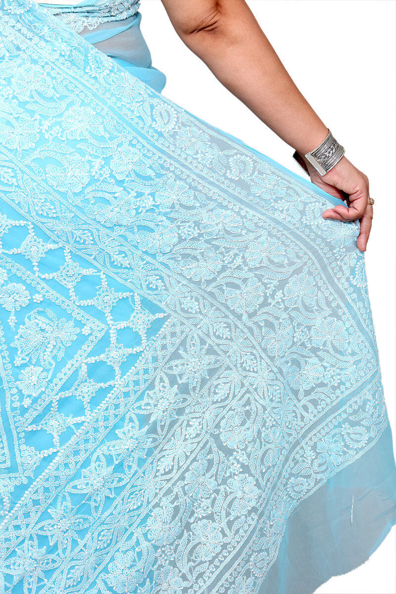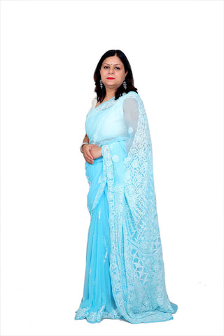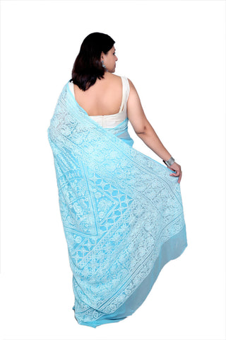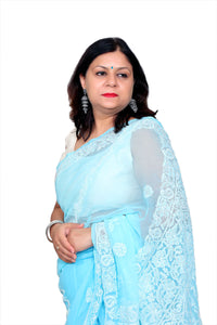 Embrace pastel perfection with this Sky Blue Georgette Chikankari Saree, adorned with white thread embroidery featuring scattered floral butis and a beautifully worked border and pallu. The lightweight, semi-sheer georgette drapes effortlessly, offering comfort with understated luxury. Versatile and refined, it’s ideal for both formal occasions and chic daytime celebrations.