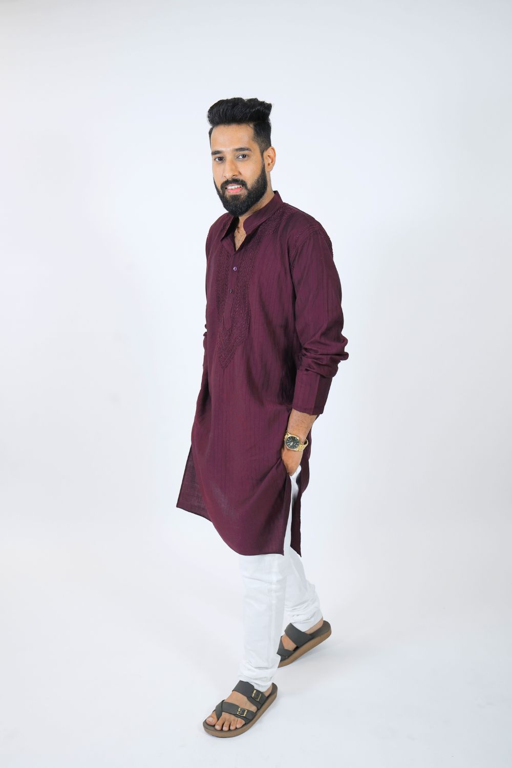 Design: Classic straight-cut kurta with a mandarin collar, button placket, and long sleeves. The lightweight mul cotton fabric ensures breathability and comfort while maintaining a refined ethnic look.