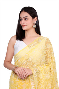 Turn heads in this yellow Georgette Saree, combining rich tradition with contemporary vibrancy. The bold color and delicate embroidery make it a perfect choice for festive and celebratory events.