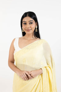 Make a statement of radiant elegance with this Yellow Georgette Saree, beautifully embroidered with Resham dhaga and Mukesh work. The vibrant yellow hue brings warmth and brightness, while the intricate threadwork and shimmering details offer timeless sophistication. Ideal for festive functions, weddings, or receptions, this saree promises a graceful fall and elegant drape. It comes with an unstitched blouse piece for a custom fit.